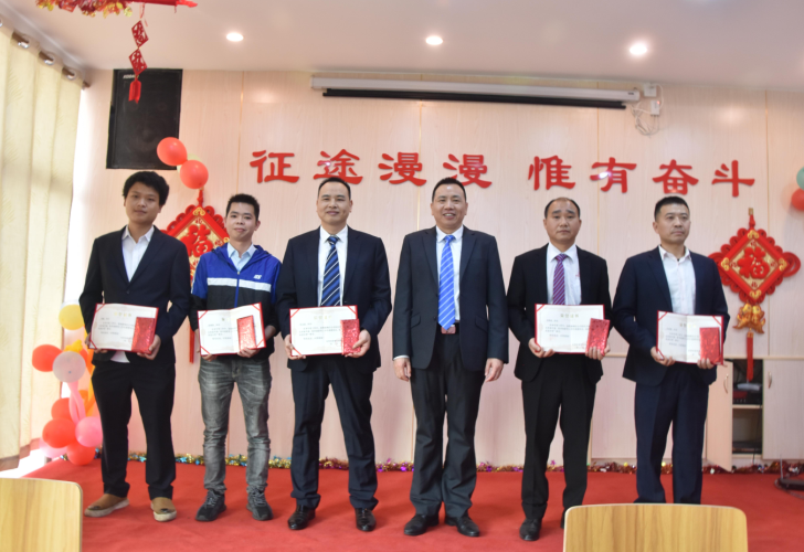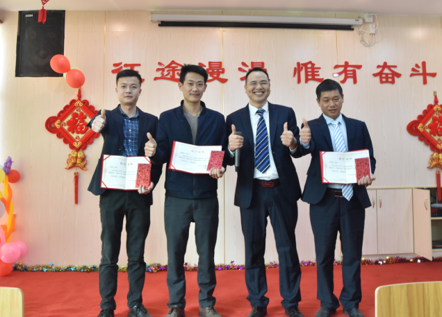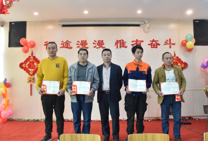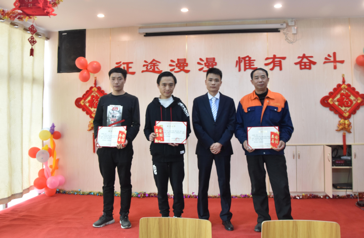 生產(chǎn)部經(jīng)理廖小強為伍志強、柳敏捷、戴剛、韋進(jìn)勇頒發(fā)先進(jìn)個(gè)人獎