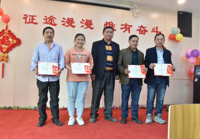 營(yíng)銷(xiāo)部經(jīng)理伍綱強為邱高明、周美芳、黃榮先、龔超頒發(fā)先進(jìn)個(gè)人獎