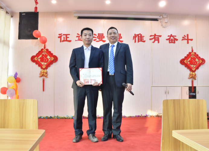 市場(chǎng)營(yíng)銷(xiāo)部經(jīng)理羅曉明為付新民、黃文頒發(fā)優(yōu)秀管理獎