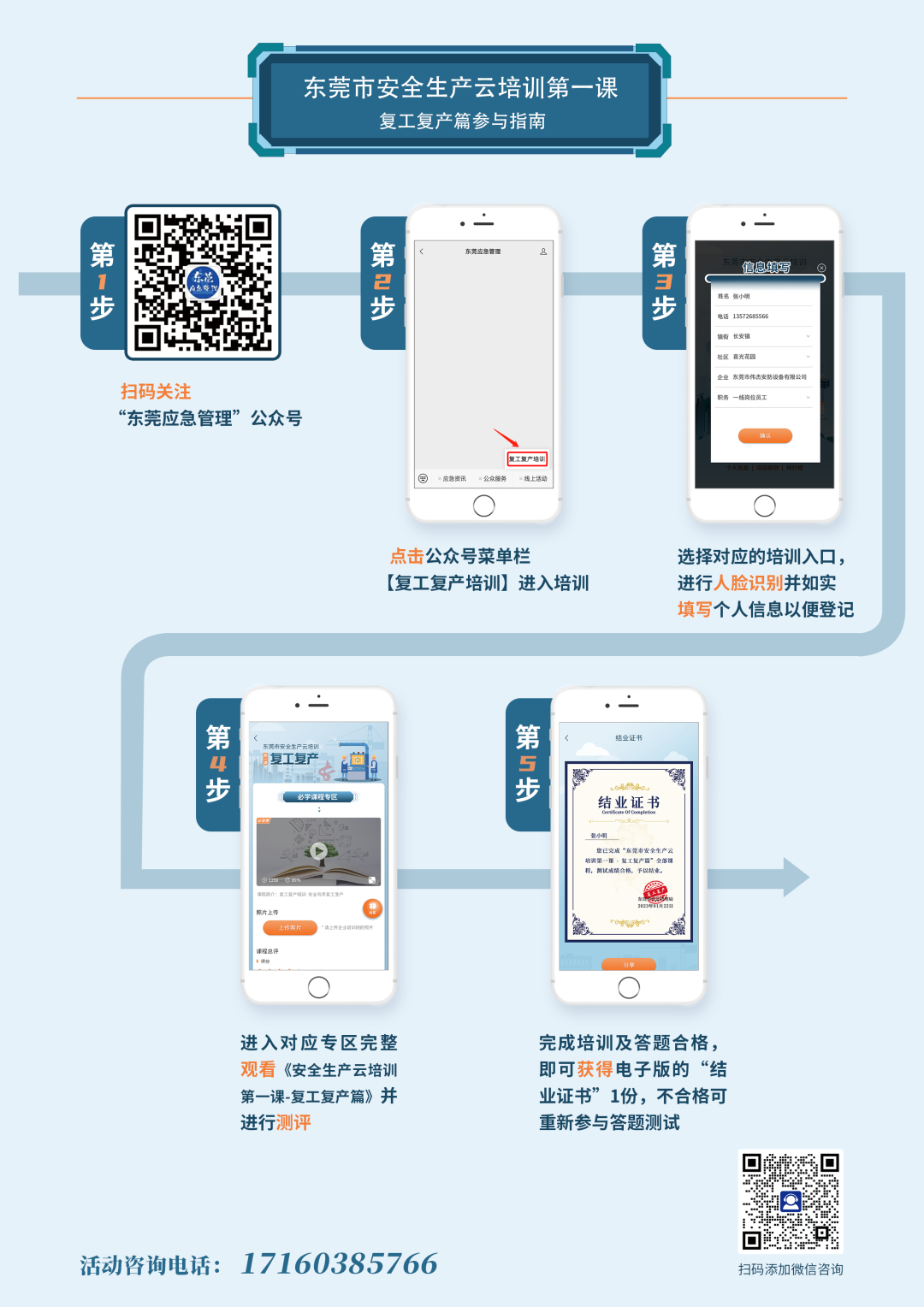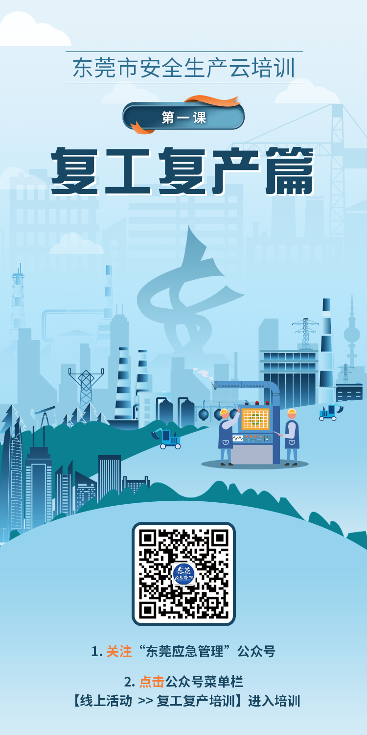 參與指南:關(guān)注“東莞應急管理”公眾號,通過(guò)點(diǎn)擊公眾號菜單欄【線(xiàn)上活動(dòng)→復工復產(chǎn)培訓】,登記個(gè)人信息,完成注冊后,點(diǎn)擊“我要參加”進(jìn)入培訓內容界面,點(diǎn)擊觀(guān)看視頻進(jìn)行學(xué)習。